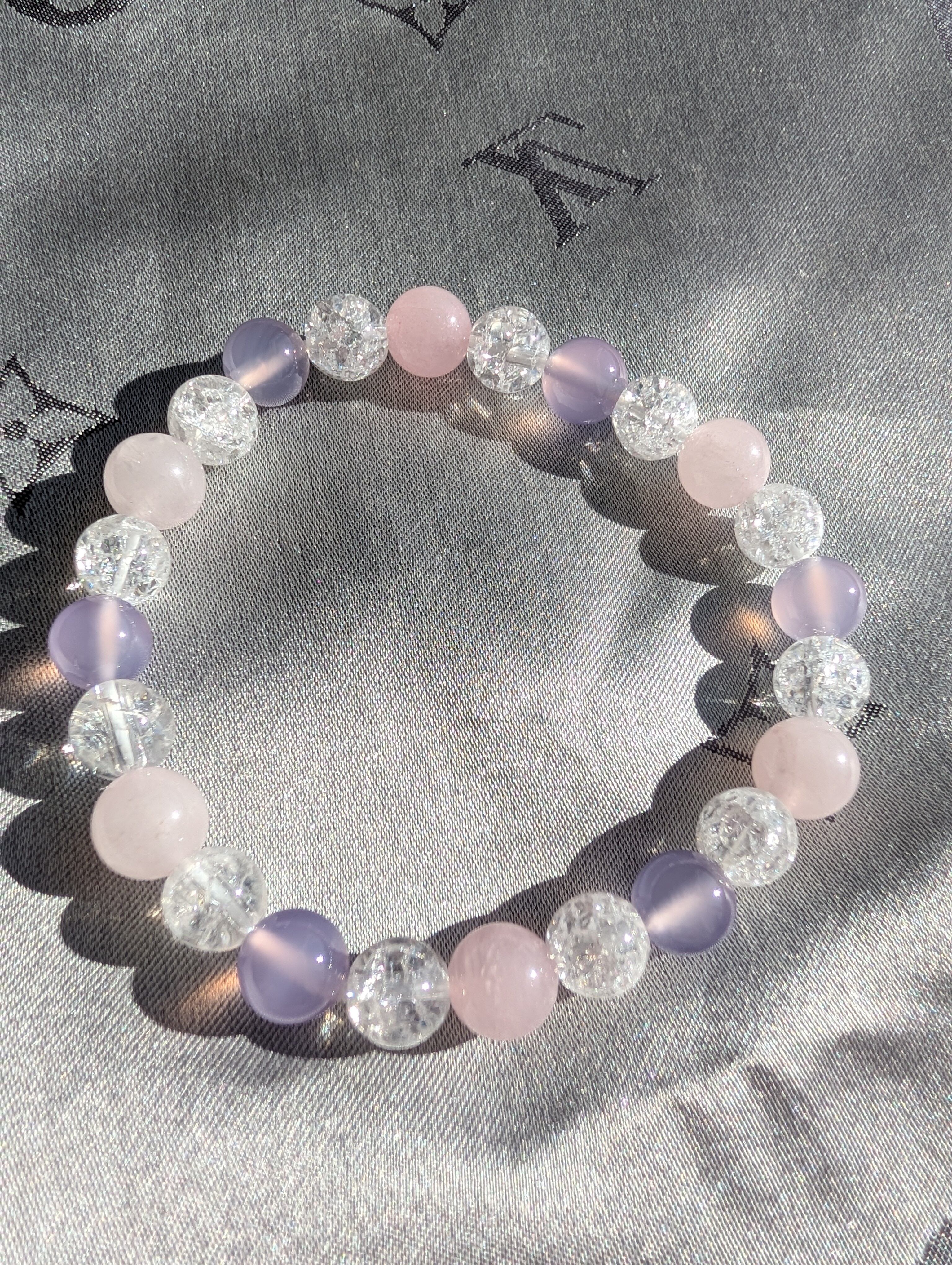 このブレスレットは、高品質なアメジストと爆裂水晶、そして美しい紅水晶を組み合わせた特別なアイテムです。アメジストは心を安定させ直感力を高めるとされ、爆裂水晶は持つ者に活力を与え、紅水晶は情熱と愛を象徴する石とされています。これらの天然石を組み合わせることで、心身の調和をとりながら、ポジティブなエネルギーを引き寄せる助けとなるでしょう。